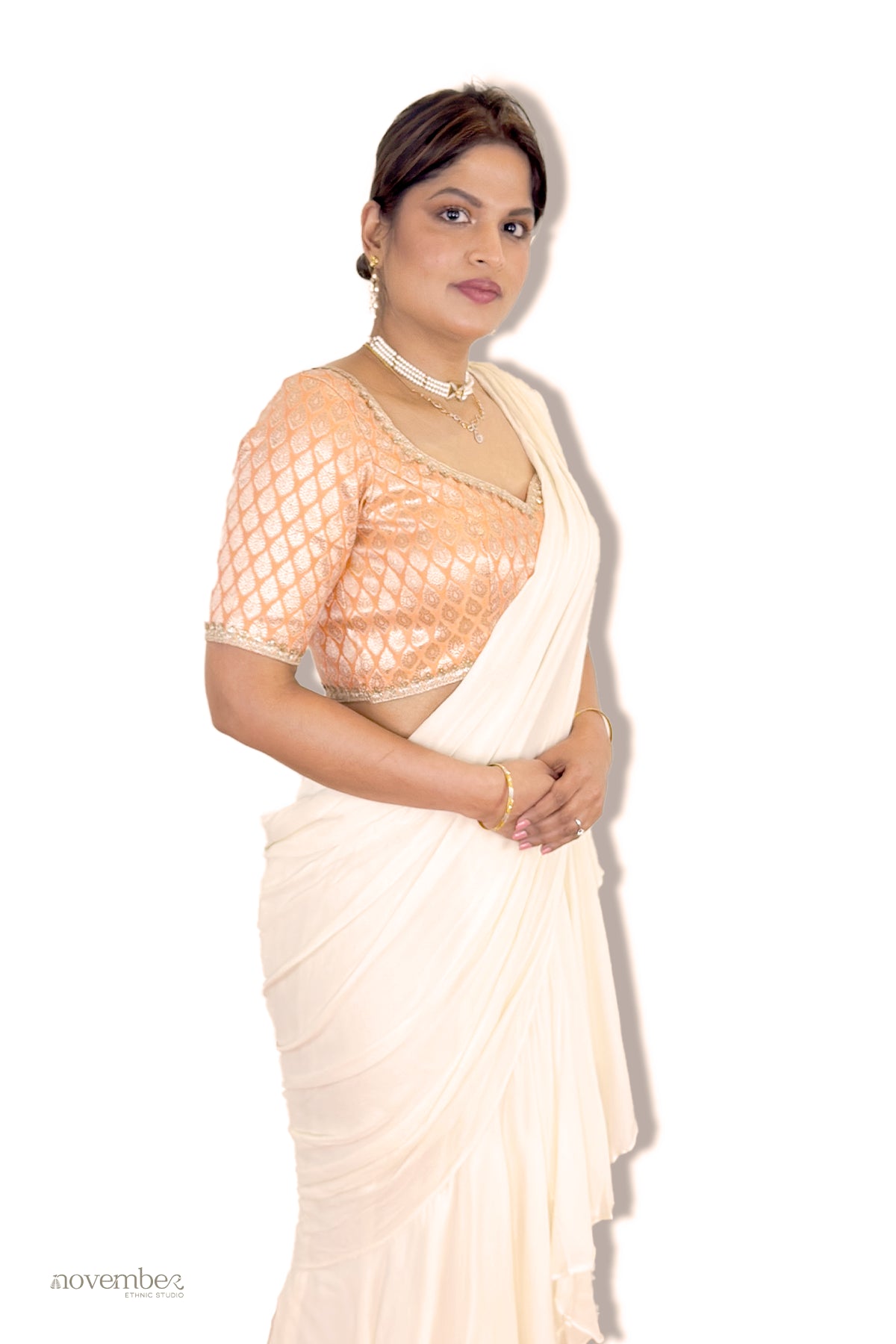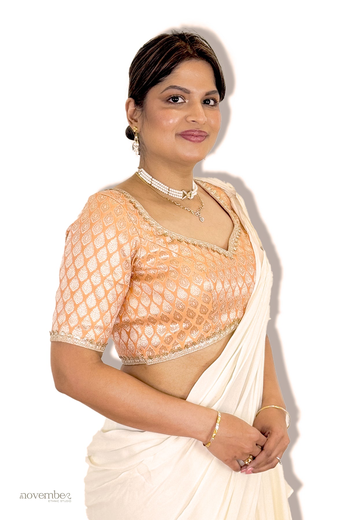 The Zarina blouse is the perfect blend of old world luxury and new world sophistication. Made from the finest brocade that is adorned with opulent zari motifs and designed in a classic silhouette, it is ideal for breathing new life into old sarees and ghagras. The pastel hues of beige and the rich sheen make it a celebratory piece in your wardrobe.