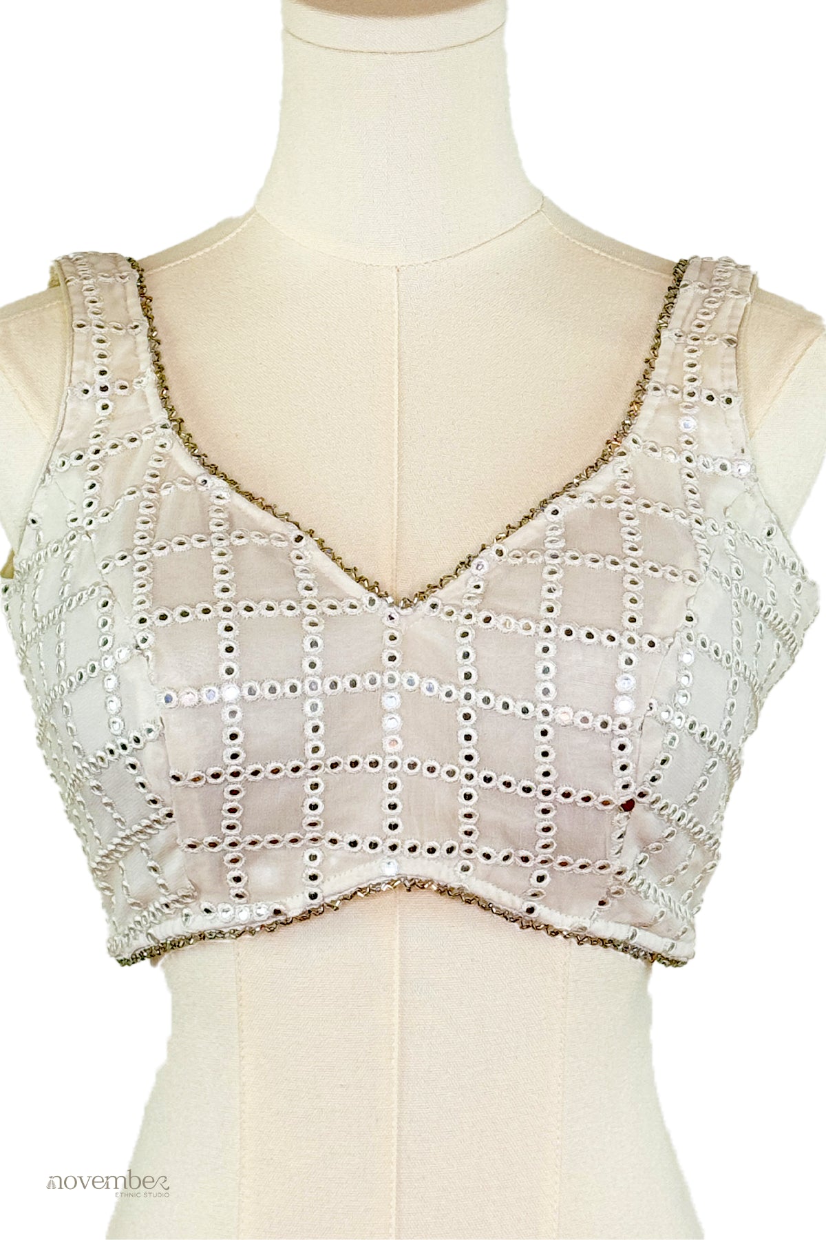 Inspired by Sridevi's iconic white saree in Chandni, we've designed the Risha Blouse which is sure to make it to your ethnic capsule wardrobe season after season. After all, who can't think of million ways to style a white and silver blouse? It is made from the softest georgette fabric that drapes beautifully and fits like skin. The mirror embroidery, silver cut dana border, and matching tassels add just enough bling for an ethereal feminine vibe. Accessorize with a small white bindi and some minimalistic jewelry, and let the blouse do the rest of the talking.